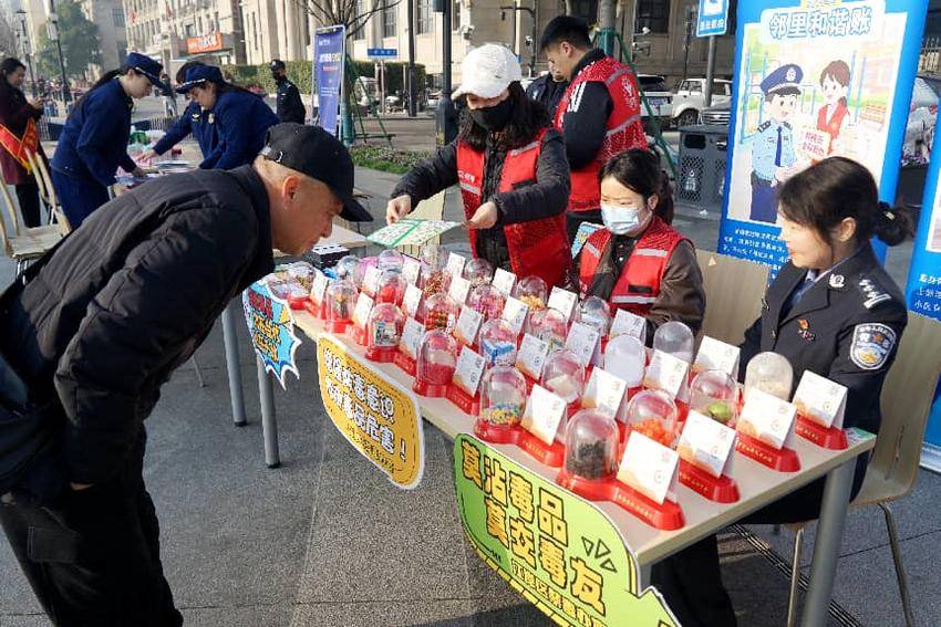 在禁毒宣传区陈列着各式仿真毒品模型,从传统类型到伪装成“奶茶”“跳跳糖”的新型毒品,让围观群众大开眼界。“这些东西看起来和普通零食太像了,真得提醒孩子多加小心!”一位市民低声感慨。禁毒民警耐心解答大家的疑问,将“珍爱生命,远离毒品”的警示深深印在每个人心中。