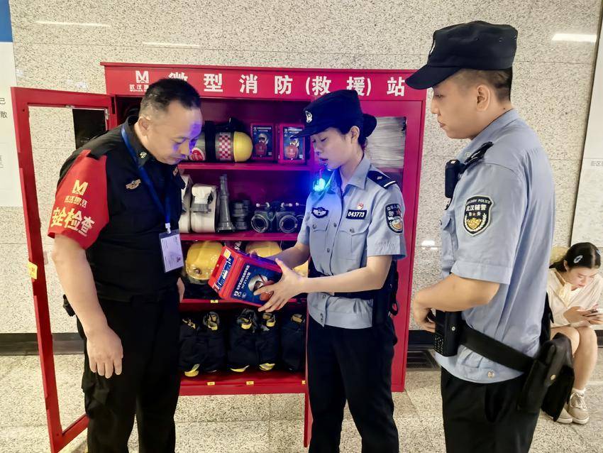 “这些消防器材一定要定期检查,确保任何情况下都有效。”8月24日下午,在地铁8号线水果湖站,民警李盼盼正带领辅警罗鸿毅、鞠昊对地铁站内的消防(救援)站进行安全排查。随后,民警还对地铁工作人员能否熟练操作消防器材等情况进行了检查。