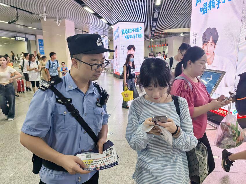 “未知链接不点击,陌生来电不轻信,个人信息不透露,转账汇款多核实。” 在护航学生平安返校的同时,武汉轨道警方还着力加强对学生的防骗宣传。8月26日下午,在地铁2号线汉口火车站,民警左迪虎带领辅警来到站厅向过往学生乘客发放反诈宣传单,提醒大家提高警惕,谨防上当受骗。