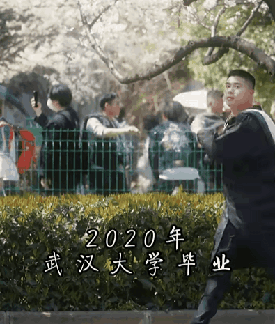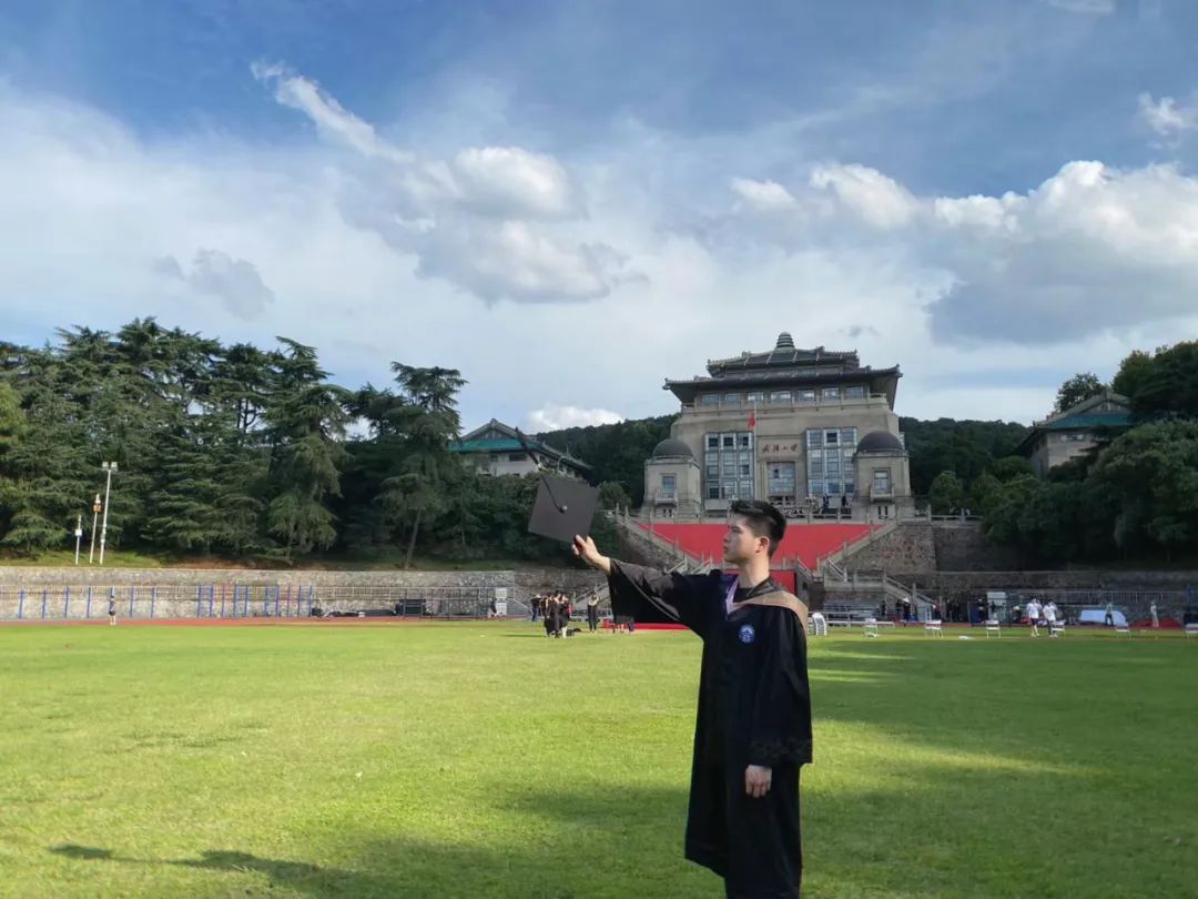 李一沐在武汉大学操场上拍摄毕业纪念照
