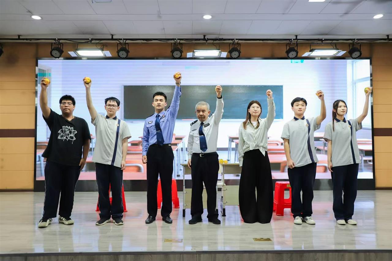 “同学们,你看这个橘子,我们砸它、摔它就会把它弄碎弄破,但是有些看不见‘伤害’对它造成的伤害却更深。”随后,警花警草和学生代表们一同演绎了一场生动形象的校园防欺凌小品《橘子课堂 青春不酸》。小品中,面对长期对同学实施欺凌行为的小张,全国公安系统二级英模、分局政务服务大队民警彭涛用橘子做比喻,将心比心地科普劝解,让小张意识到了自己的错误,精彩的表演赢得了台下的阵阵掌声。