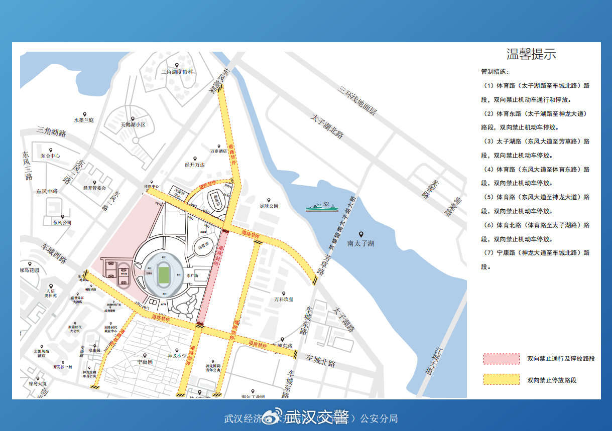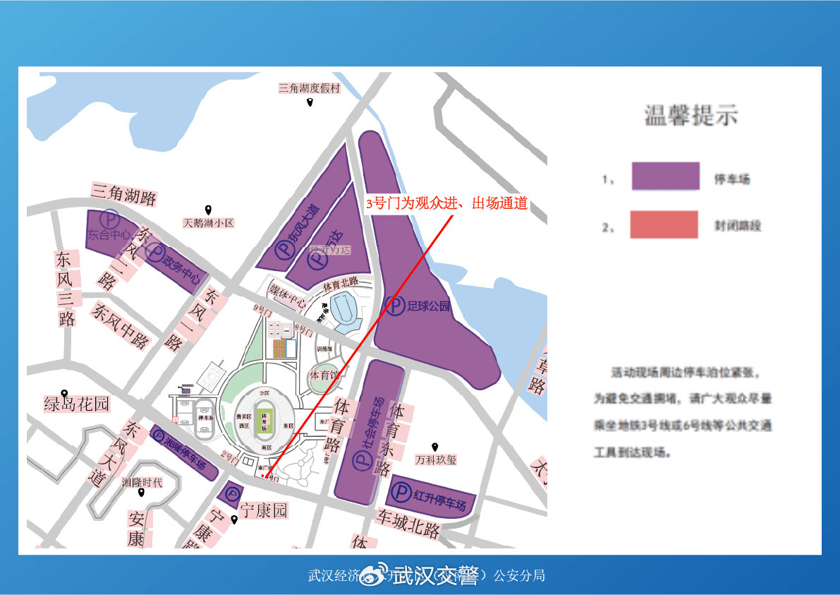 1.由于当天观众较多,体育中心周边道路车流增多,前往体育中心周边的人员请尽量错峰出行,高峰时段请做好出行规划,尽量避免进入体育路(东风大道至神龙大道)、太子湖路(东风大道至芳草路)、体育东路、车城北路(东风大道至车城东路)、宁康路路段,需通行该区域的人员或车辆,可选择绕行神龙大道、沌阳大道、太子湖北路、江城大道等外围道路。