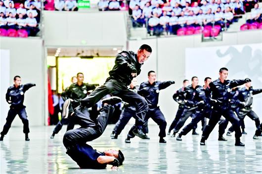 勤务礼仪、交通指挥展示首先登场,身姿手势整齐而优美;接着演练警棍盾牌操,咚咚的脚步声震撼而威严;一招制敌格斗术随后精彩呈献,近距离对抗,一气呵成的擒拿动作,激起阵阵掌声。