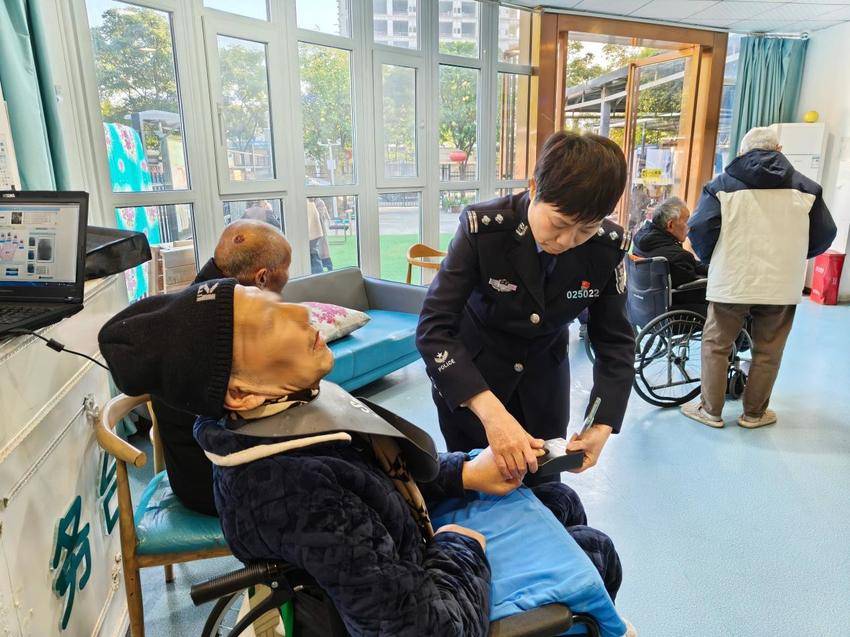 “我们这就过去!”民警王红雁带着设备赶到养老院,见老人行动受限、听力不佳,特意放慢语速沟通。帮助方婆婆整理衣领调整状态,扶陶爹爹坐稳配合指纹采集,还简化了填报流程,全程手把手协助操作。不到10分钟,两位老人的补证手续全部办结。
