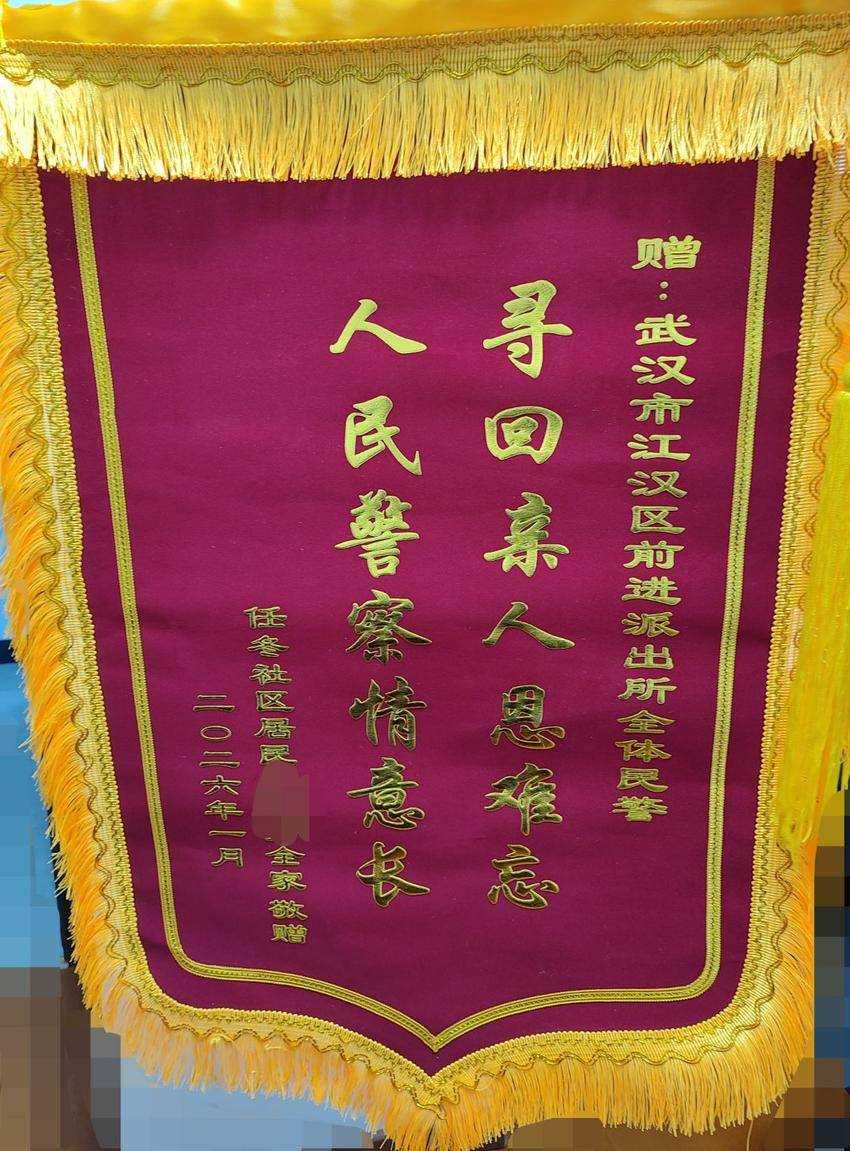(通讯员 尹凌霄)2月2日上午,江汉区居民万女士特意带着母亲来到武汉市公安局江汉区分局前进派出所,将一面印有“寻回亲人恩难忘,人民警察情意长”的锦旗送到民警陈志军手中,感谢民警不辞辛劳奋战十余个小时,寻回了她走失的母亲。