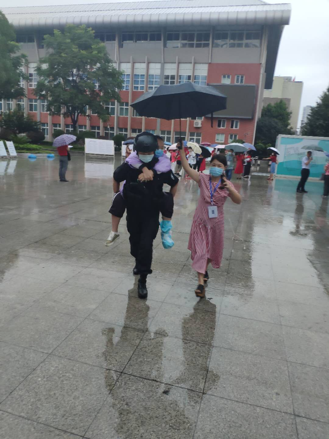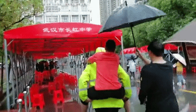 武汉市一中考点门前,特警支队驻江汉大队三名特警正执勤,看到一名腿上打着石膏的考生,缓缓进入考场。上前了解情况后得知,该考生左腿骨折,不能淋雨也不能用力,立即决定将其背进入考场。