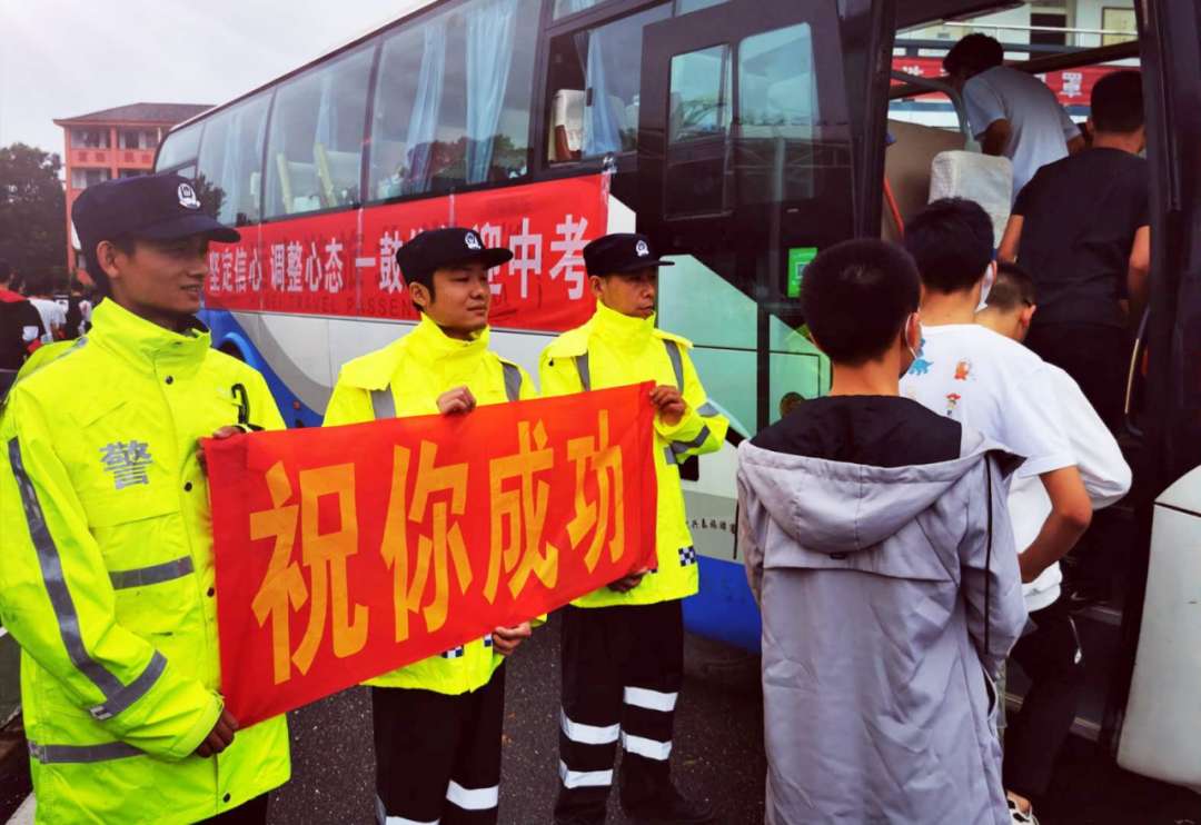 江夏区公安分局乌龙泉派出所19日下午为启程奔赴中考考点的乌龙泉学子举牌鼓劲、助力护航!