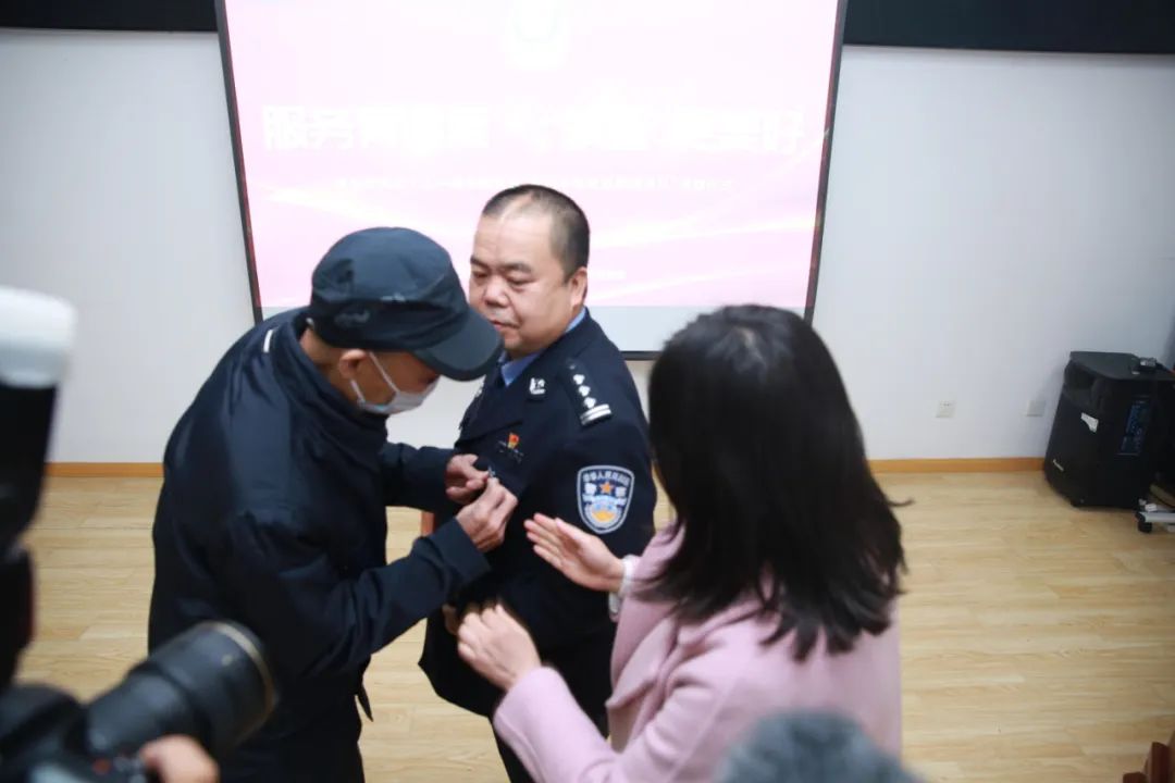 10月20日上午,上级来到社区警务室为肖利军颁授功章,89岁的胡荣正和老伴早早赶来,坚持亲手把功章戴在肖利军胸前。