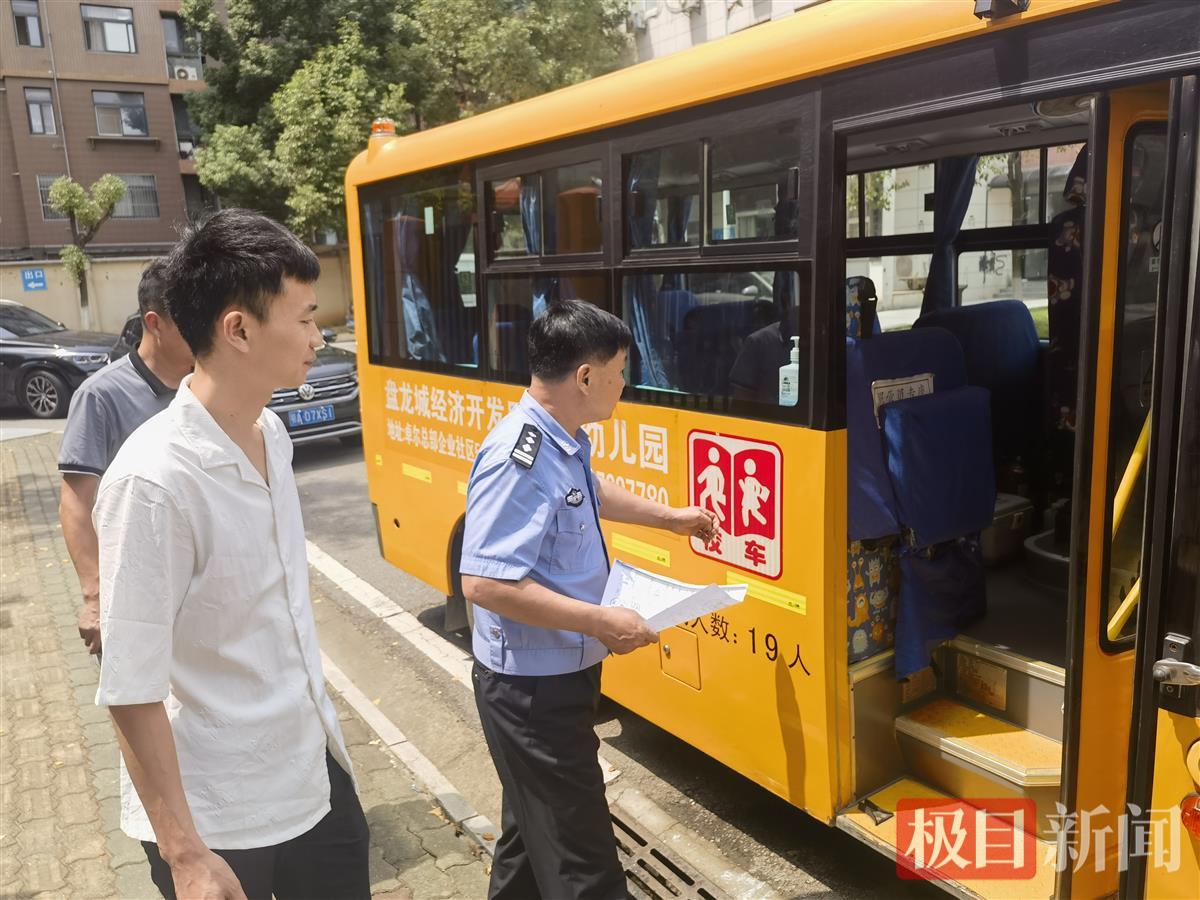 责任民警郭均建对133名校车驾驶员驾驶资质、年审情况等基本情况进行了核对,现场对驾驶员进行了毒品毛发检测,对123台使用中的校车刹车、轮胎、警示灯、指示牌、监控、灭火器、安全锤等安全设施进行详细检查,对检查中“未达标”的校车现场下达《隐患整改通知书》,在9月1日前整改完成并进行复检。