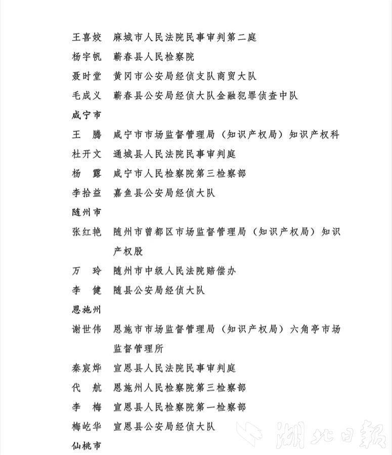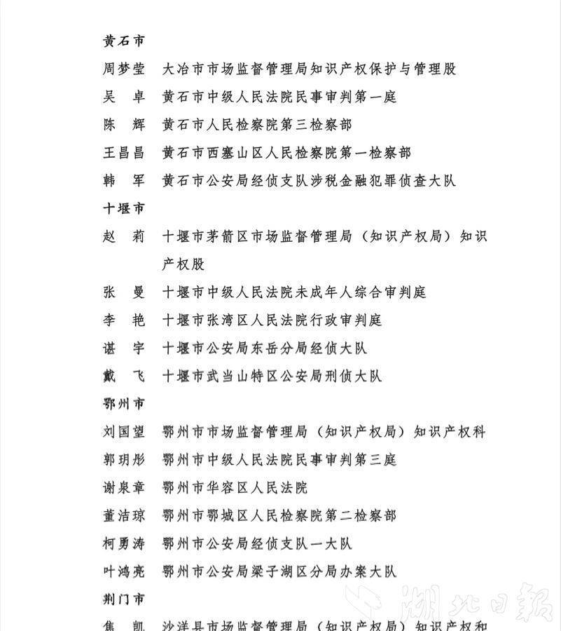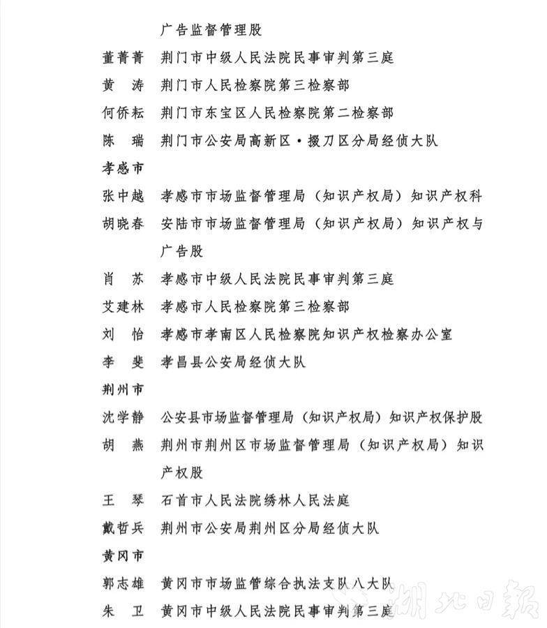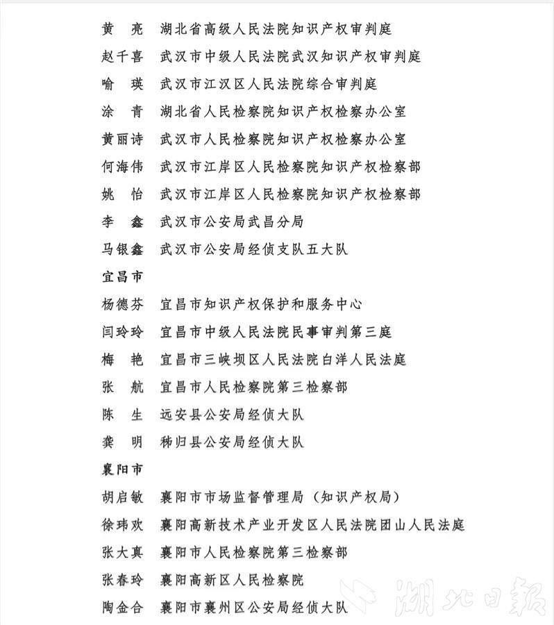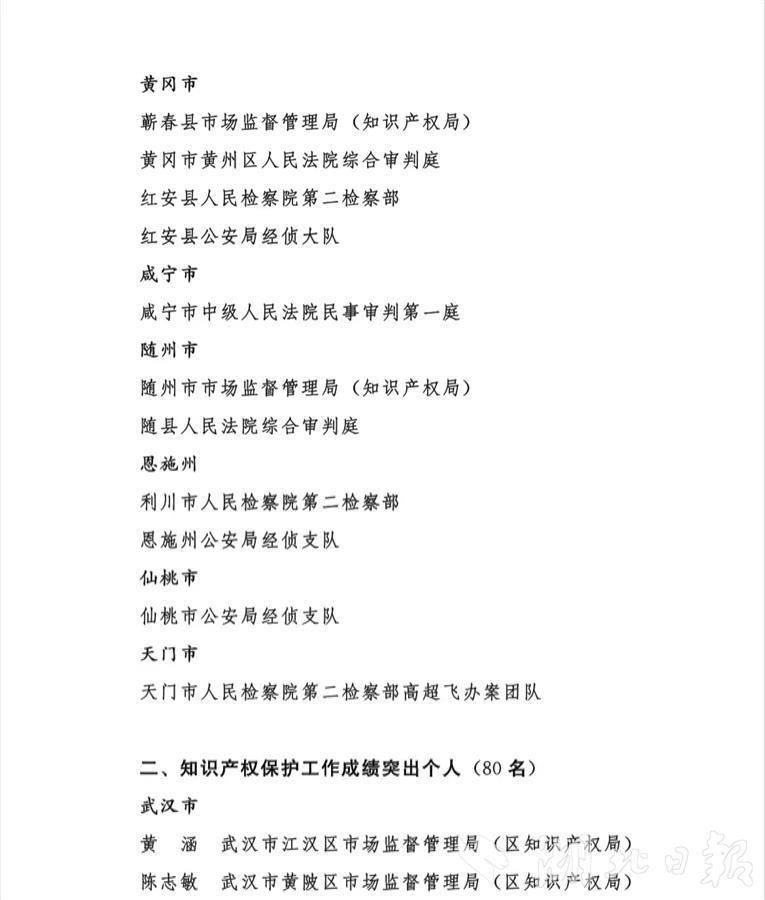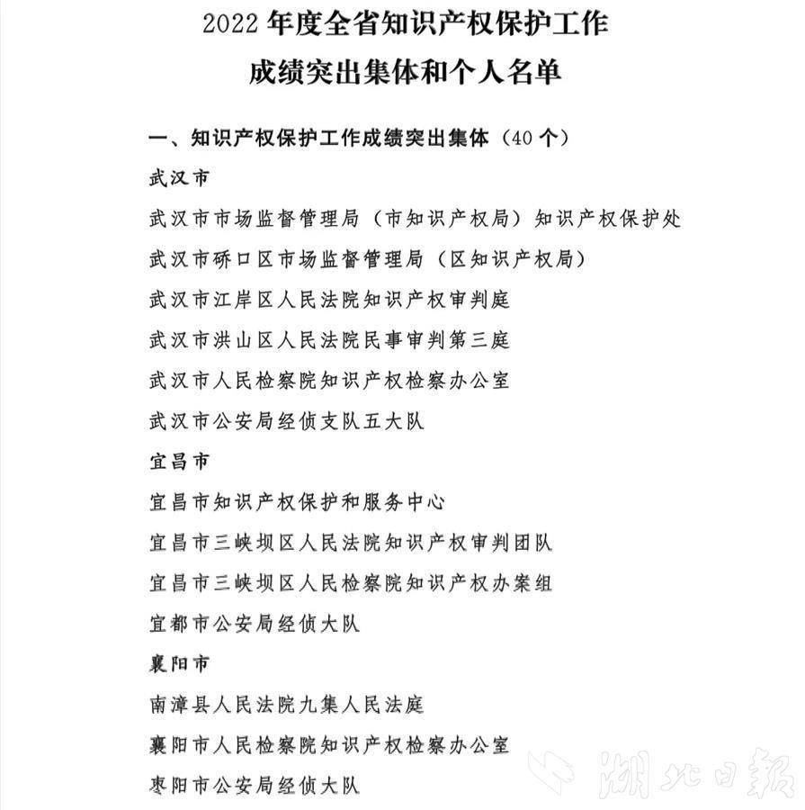 (记者文俊、通讯员瞿凡、林园)近日,湖北省知识产权局、湖北省高级人民法院、湖北省人民检察院、湖北省公安厅联合印发《关于通报表扬2022年度全省知识产权保护工作成绩突出集体和个人的通知》(下称通知),对2022年度全省知识产权保护工作成绩突出的40个集体和80名个人予以通报表扬。全省知识产权系统、人民法院、人民检察院、公安机关各有10个集体和20名个人受到通报表扬。