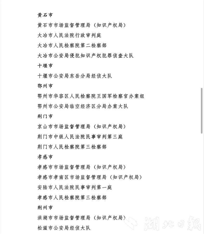 通知指出,近年来,全省知识产权系统、人民法院、人民检察院、公安机关认真贯彻落实党中央、国务院关于全面加强知识产权保护的决策部署和省委、省政府工作要求,依法严厉打击侵犯知识产权违法犯罪行为,切实维护权利人合法权益,积极营造良好的创新环境和营商环境,为加快推进知识产权强省建设、促进湖北高质量发展提供了有力支撑。