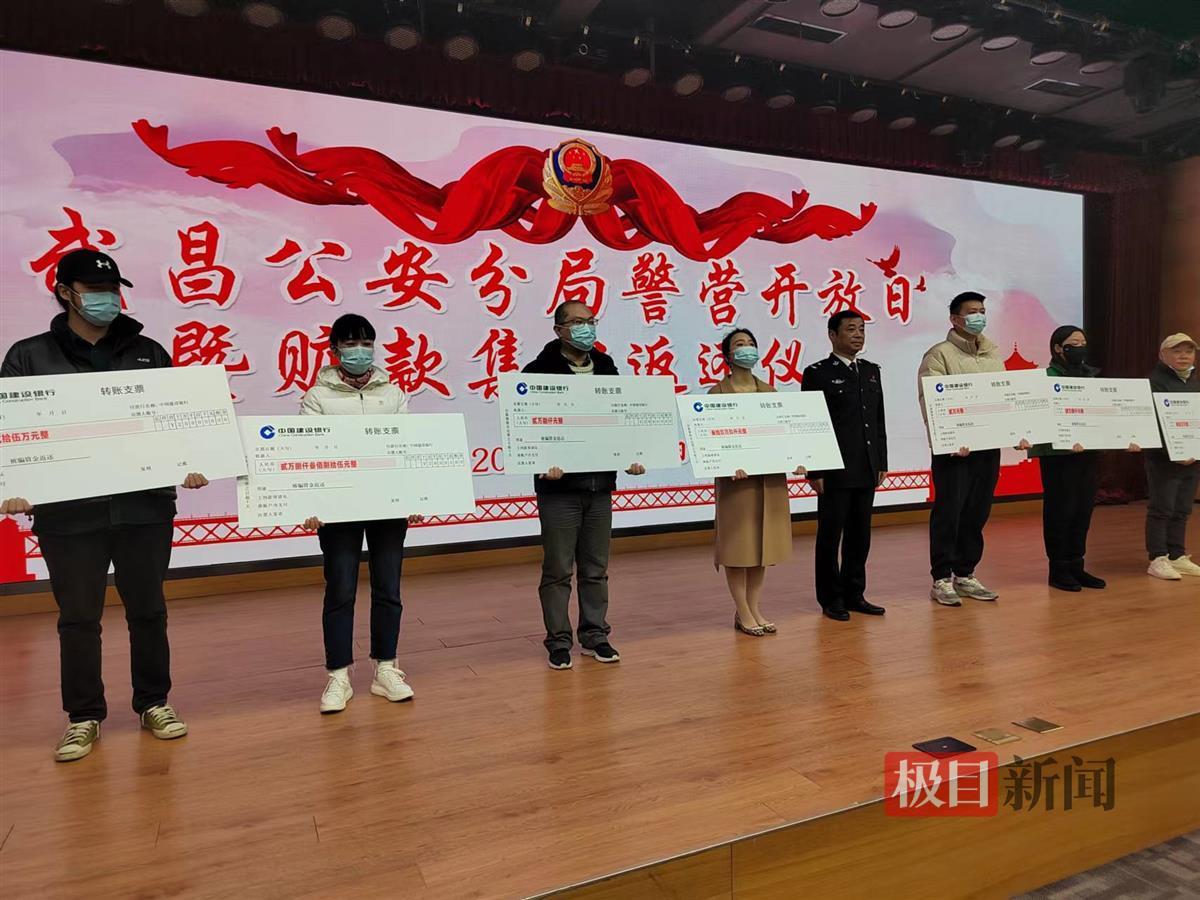 参观了打击网络犯罪中心之后,与会代表来到会场。武昌区公安分局领导向受害群众集中返还196万元赃款。
