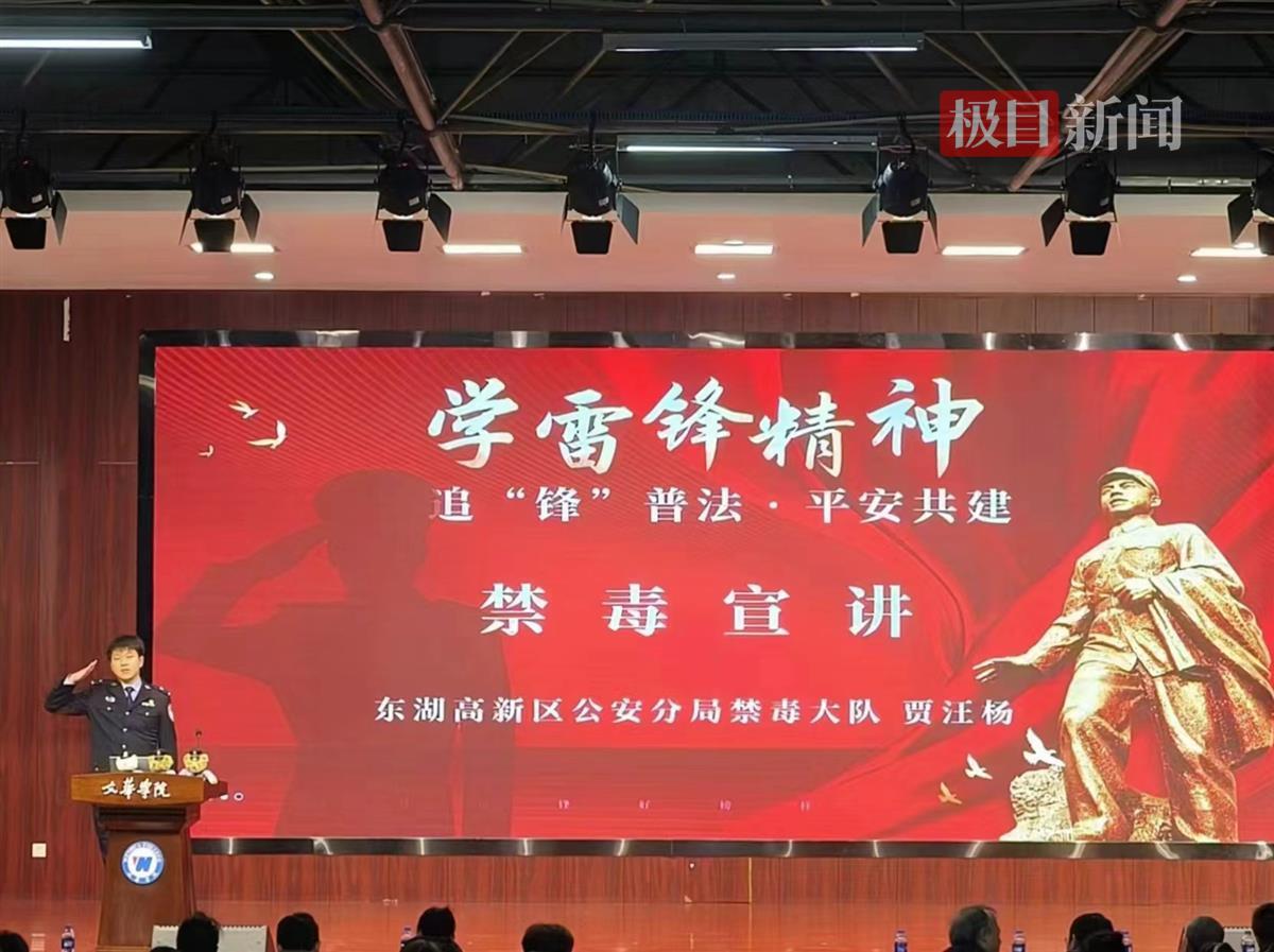 “我们要像雷锋同志一样,时刻保持清醒的头脑,这样才能坚决拒绝毒品的诱惑。”来自东湖高新区公安分局禁毒大队贾汪杨警官进行了禁毒宣讲,面对坐满学生的观众席,他详细介绍了各种毒品的种类和危害,以及如何预防和抵制毒品的侵害。贾汪杨警官通过生动的案例和事实数据,让大家深刻了解到毒品对个人、家庭和社会的巨大危害。