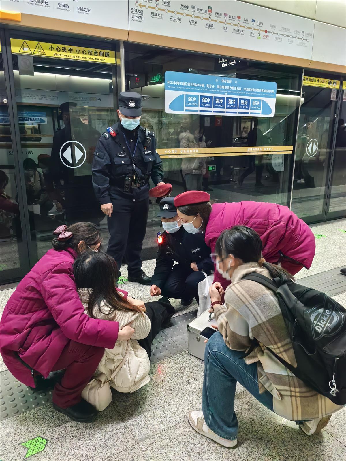 3月3日,一名女乘客中午没有吃饭,在乘坐地铁途中突然晕倒在站台。武汉市公安局轨道交通管理分局辅警接到求助后,及时赶到现场救助,并一路小跑到商店买来巧克力,取来热水。幸好救助及时,该名女乘客目前并无大碍。