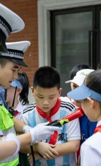 在学习过程中,学生们最感兴趣的是交警查缉酒驾的警械装备,陈松警官和王崇警官分别向大家讲解了每样装备的名称和使用方法,又开始向大家演示如何操作,学生们也能举一反三,想出各种方法来体验警械装备的使用效果。