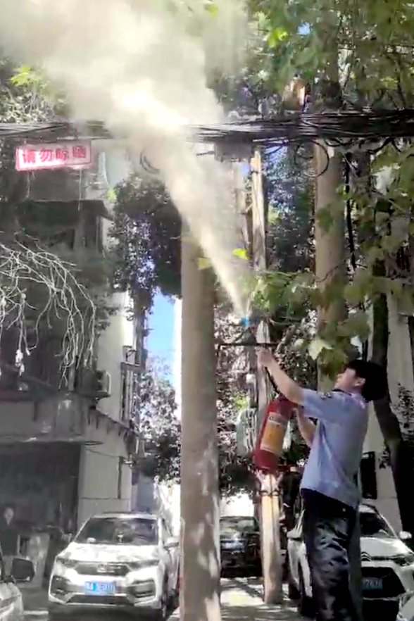 当班民警罗煜琪、辅警刘智鑫随即提着灭火器迅速赶赴现场,发现有一根电线杆上的高空电线正在燃烧,掉落的火星点燃了下方电线团,辅警刘智鑫(退伍战士)果断拔掉插销,喷灭下方着火点。挂职副所长秦思指挥现场附近车辆挪开避险,等待消防、供电部门到达现场后交接,及时处置了险情。(唐时杰 罗煜琪)