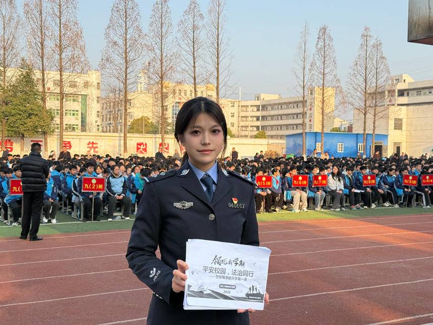 (通讯员吴寒 宋锦坤)春和景明,暖意渐浓。3月11日早8时许,晨间的阳光洒满武汉市新洲区实验中学的操场,全校师生整齐列队、身着整洁的校服,神情昂扬地参加新学期开学典礼。不同于以往常规流程,今年的开学典礼上,武汉市公安局新洲区分局邾城街派出所“00后”女民警沈慧茹,身着藏蓝警服、面容清秀,带着满满“安全干货”,以“知心姐姐”的身份,为学子们送上了一堂别开生面的安全宣讲课,为新学期保驾护航。