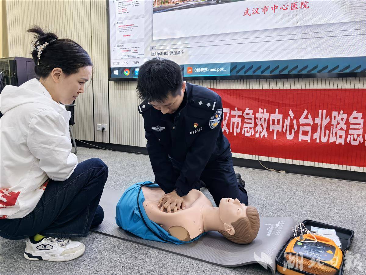 “使用AED时,电极片要贴在右上胸部和左乳外侧,贴好后插上电极插头。”3月13日护跑团集结当天,武汉市公安局专门邀请了武汉市中心医院的医护人员,为全体护跑队员开展医疗救护专项培训。