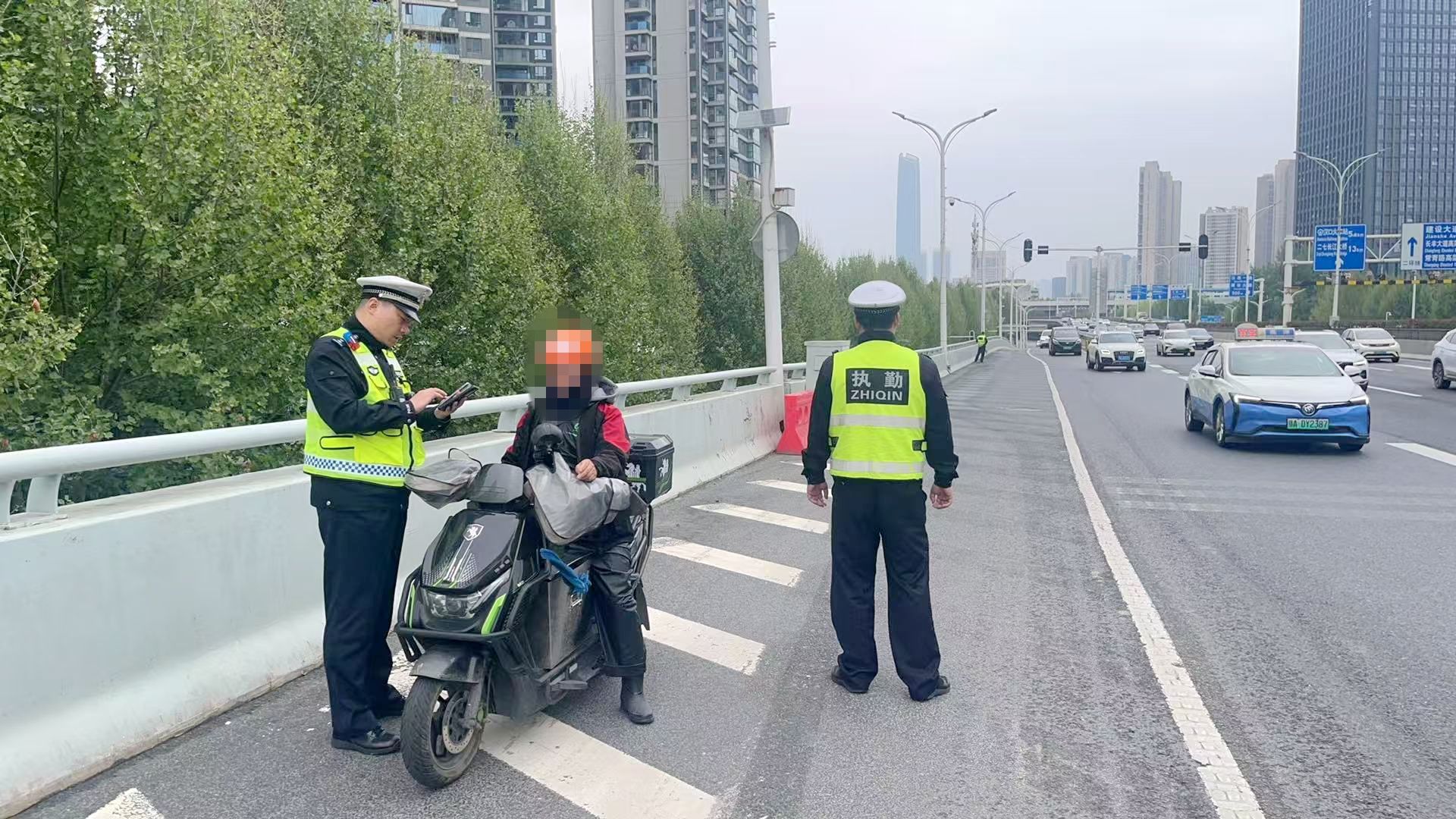 汉阳大队在文化宫环岛跨线桥拦停违规上桥的电动自行车,现场讲解交通法规与安全风险,引导驾驶人文明骑行。