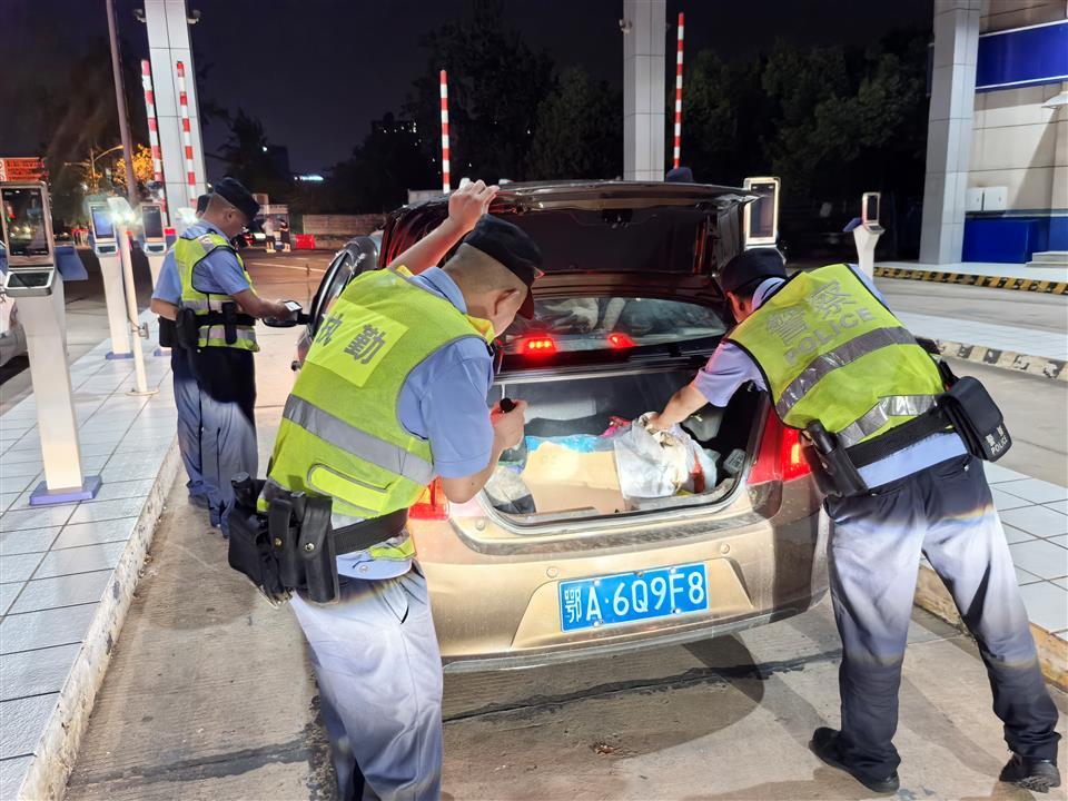 “师傅,请出示下身份证,并打开后备箱配合检查。”9月的夜晚已带凉意,府河检查站的灯光却格外明亮。民警彭立新指尖在警务通上轻划,目光仔细核对屏幕上的信息与驾驶员本人是否一致。身旁的两名辅警弯腰查看后备箱,手电筒扫过行李箱缝隙、备胎凹槽,“重点查管制刀具、易燃易爆等违禁品。”彭立新一边提醒,一边接过另一位乘客的证件。