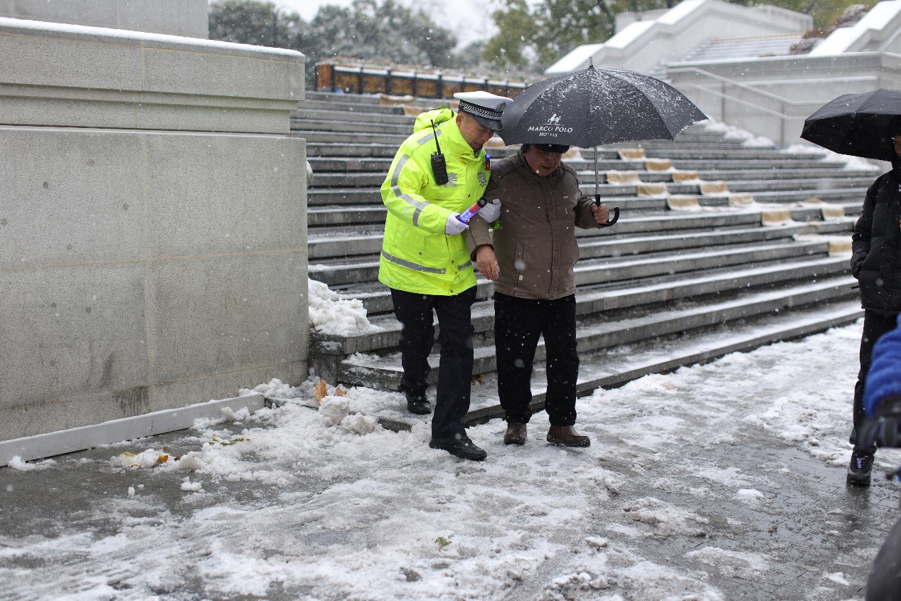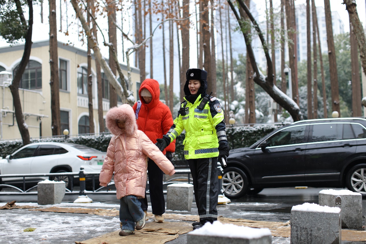 同一时间,一元路小学门口,交警江雅莉蹲身牵起怯于过马路的小女孩,在积雪中走出两串温暖的脚印;沿江大道三阳路口,民警黄念悉心搀扶拄拐老人安全过街,用行动诠释“民有所需、警有所应”。