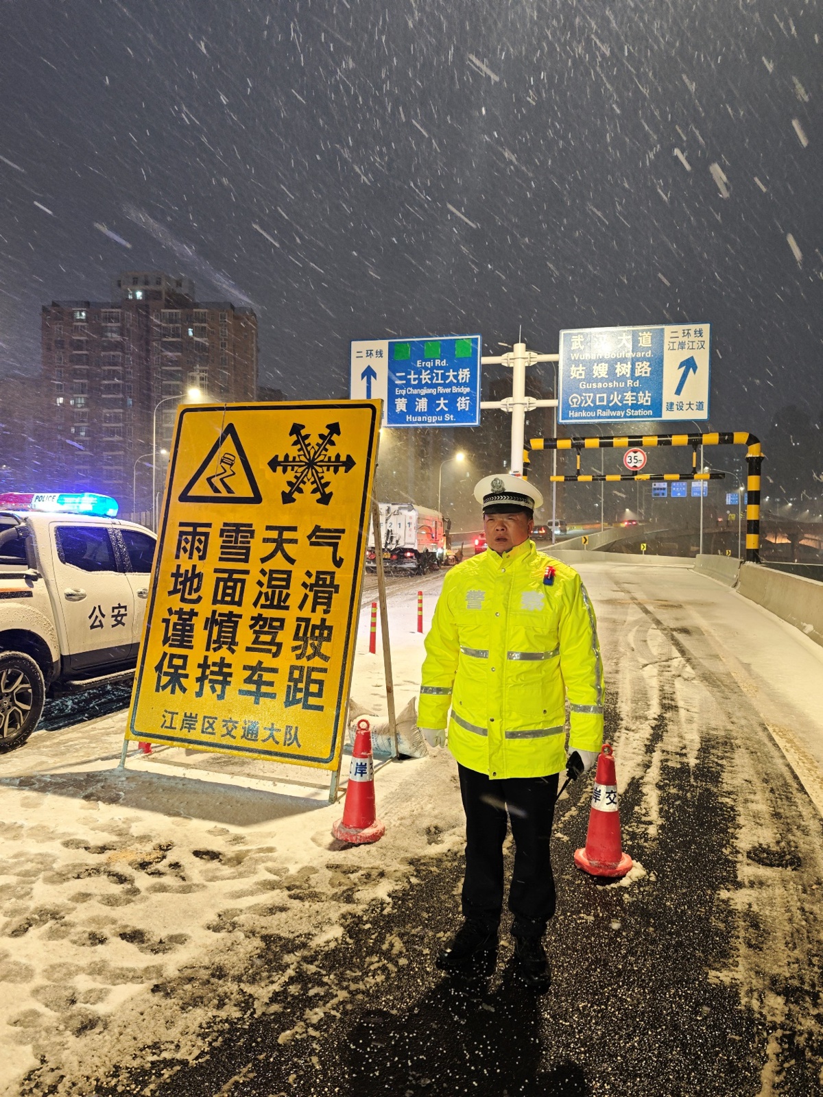 针对降雪持续影响,江岸公安运用“实地巡逻+视频巡查”模式,每小时报送路面情况,通过远端控制、中途分流、近端疏导等措施快速处置堵点。