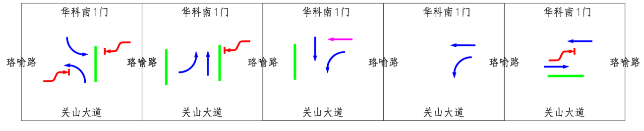 2020年,关山大道珞喻路路口纳入我局交管部门精致路口创建工作,辖区交通大队采取多种措施,缓解该路段交通拥堵问题。一是分离左转和直行车辆,减少对放时冲突。西进口分离左转和直行车道,左转车辆提前等候红绿灯,利用对向车道通行;南进口分离左转和直行车道,最右侧彻底调整为直行专用车道;配套完善信号灯,直行左转信号灯分开设置。二是挖掘路口空间,提高机动车通行效率。东进口设置直行待行区;西进口设置借道左转等候区;西进口右转渠化设置2股车道,满足现状流量需求;南进口掉头提前至停止线前,提高路口通行效率。三是完善非机动车设施,优化过街秩序。利用现状斑马线,设置4m宽非机动车过街通道;配套非机动车地面标记、标志设置相关设施;四是优化路口信控方案,共四相位,嵌套1个搭接相位。关山大道(南)、华科南1门左转对向放行,珞喻路东西均进入借道左转等候区;珞喻路(西)左转、关山大道(南)直行,珞喻路(东)进入借道左转等候区;华科南1门直行,珞喻路(东)左转,珞喻路(东)直接进入待行区;珞喻路东西直行对向放行,珞喻路(西)进入借道左转等候区。