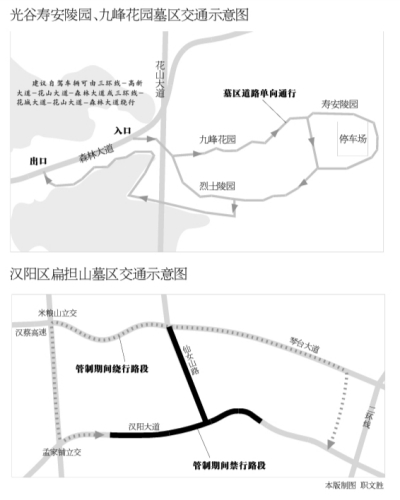 4月5、6、7日,每日7时至17时,前往万福净土陵园车辆一律由新施公路七架山路口进入,沿宋岗村,清水塘乡村公路至机场路单向通行。前往潘庙陵园的车辆,一律由阳福线万家咀路口进入,沿祠堂湾、卡地亚公馆乡村道路至高新街单向通行。